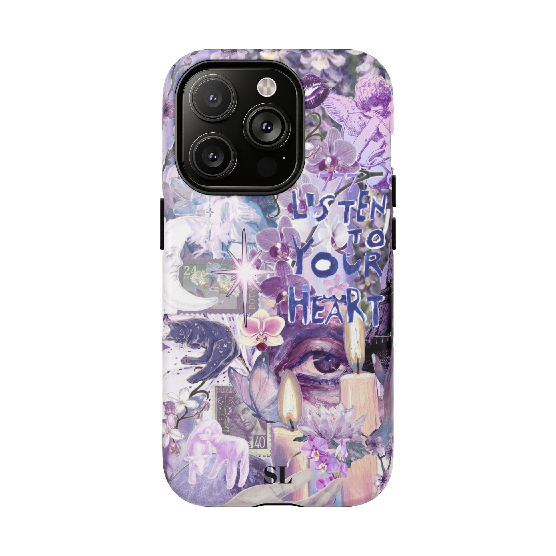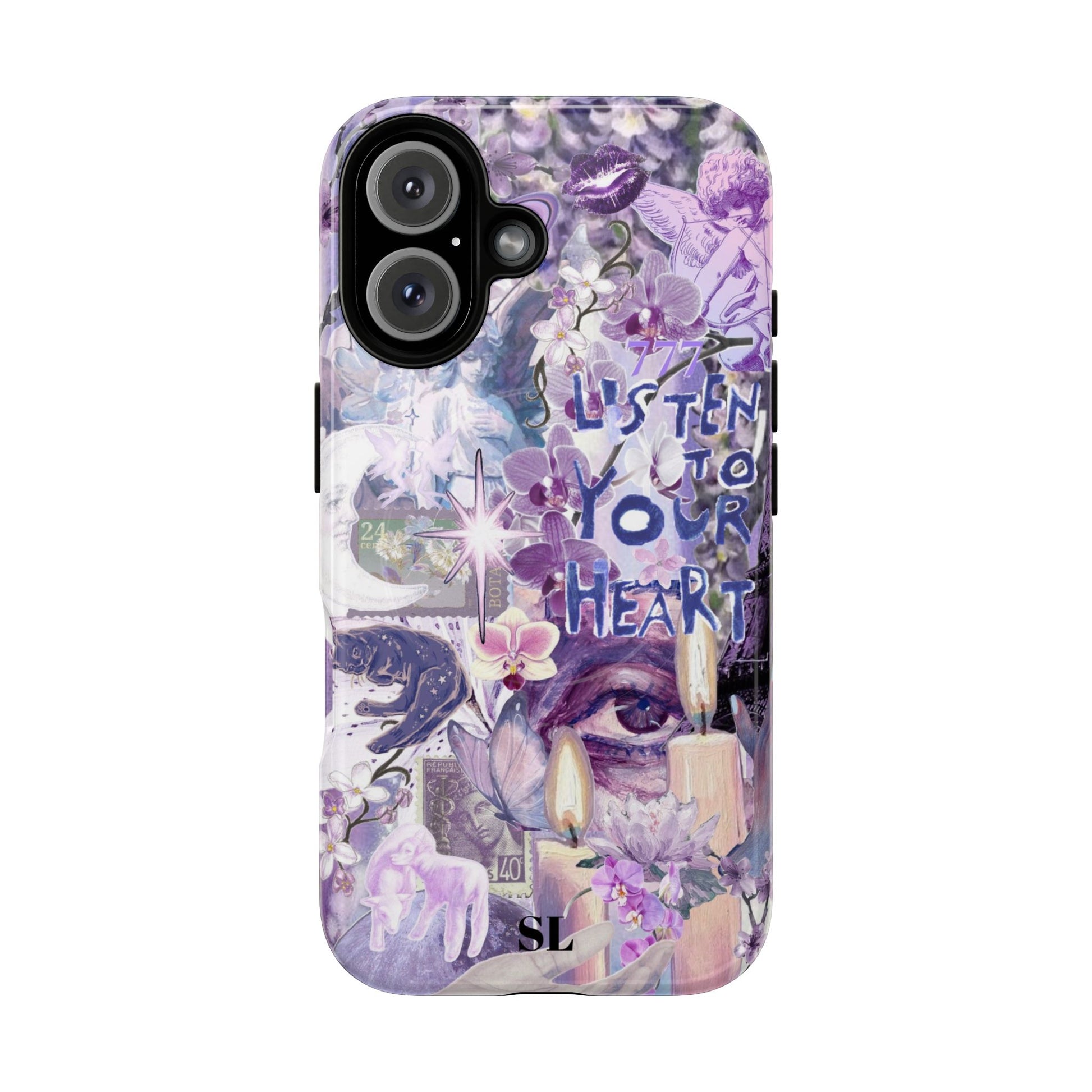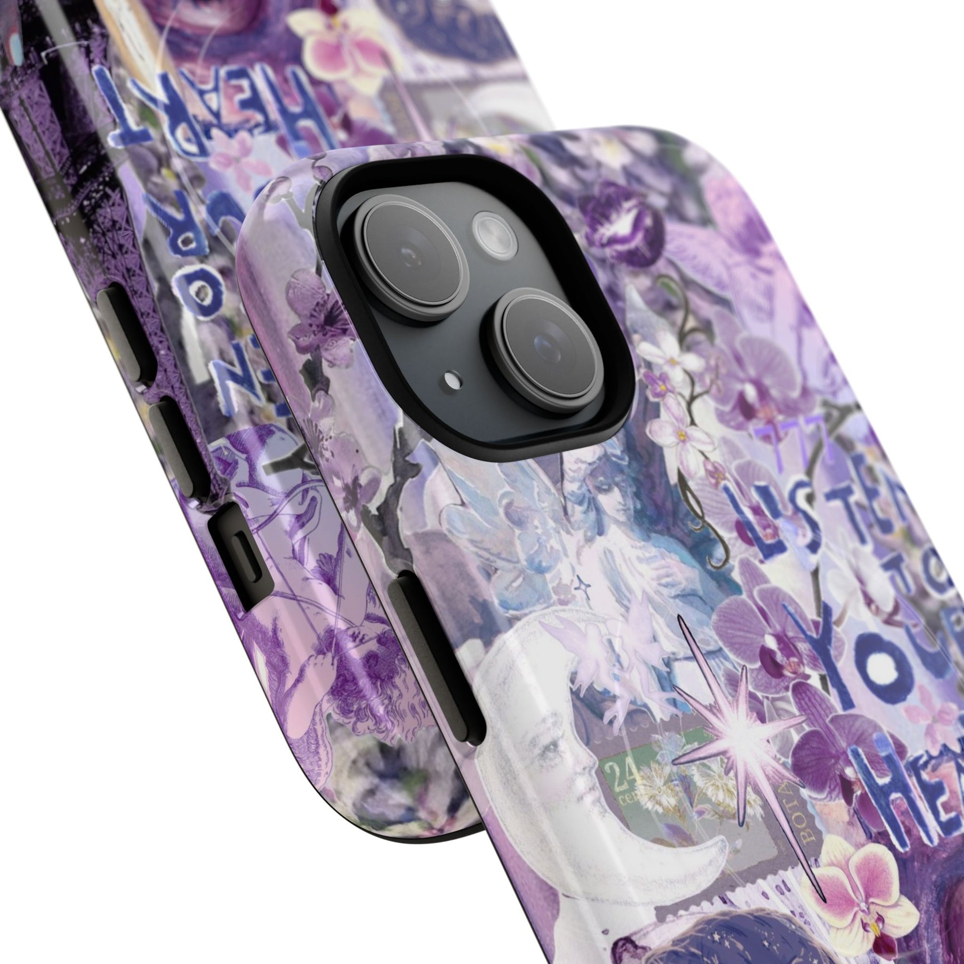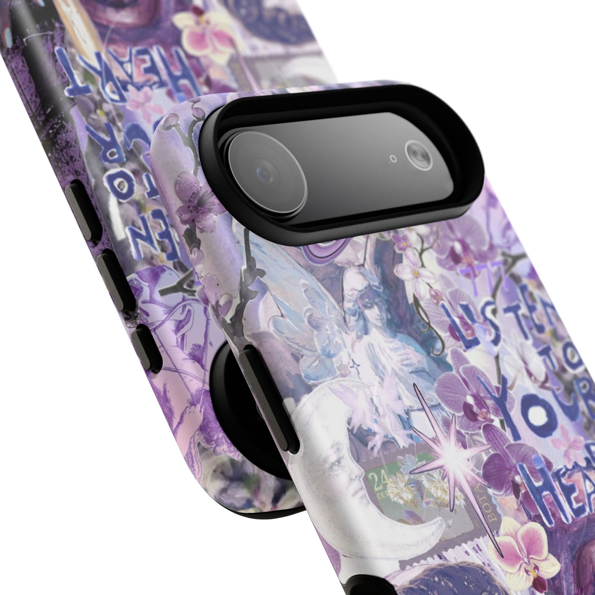 Dive into a mystical daydream with the "Reverie Purple" phone case. Ethereal purple orchids, celestial icons and the soulful "Listen to Your Heart" mantra create a visual rhythm that mirrors your favorite deep-cut tracks, the perfect backdrop for a life lived in tune.