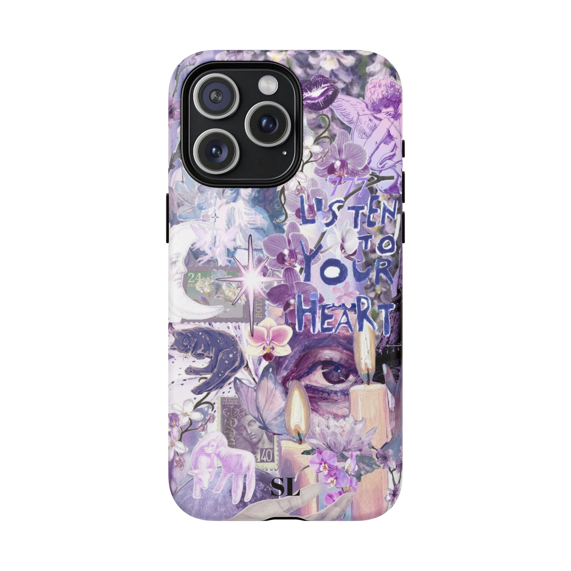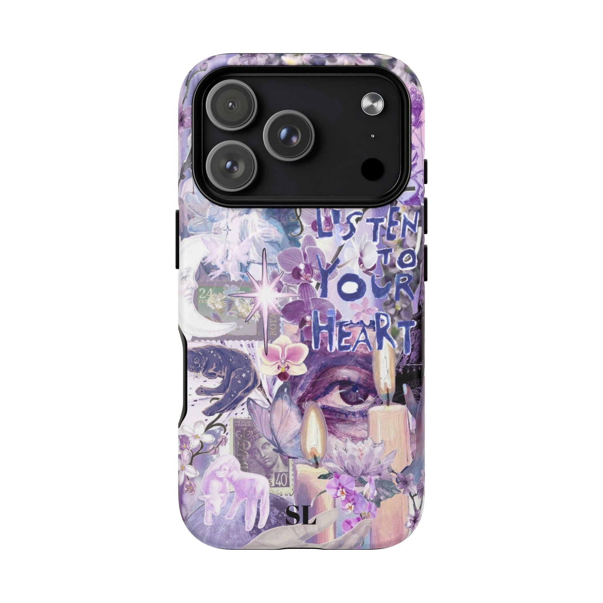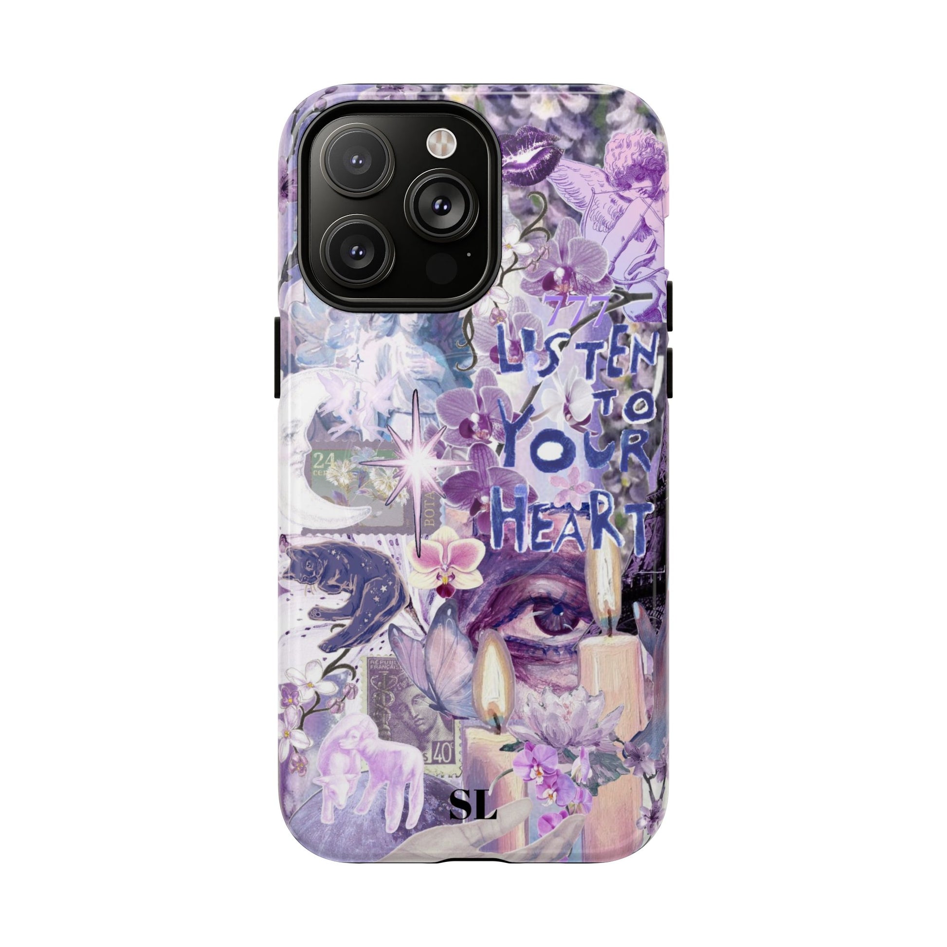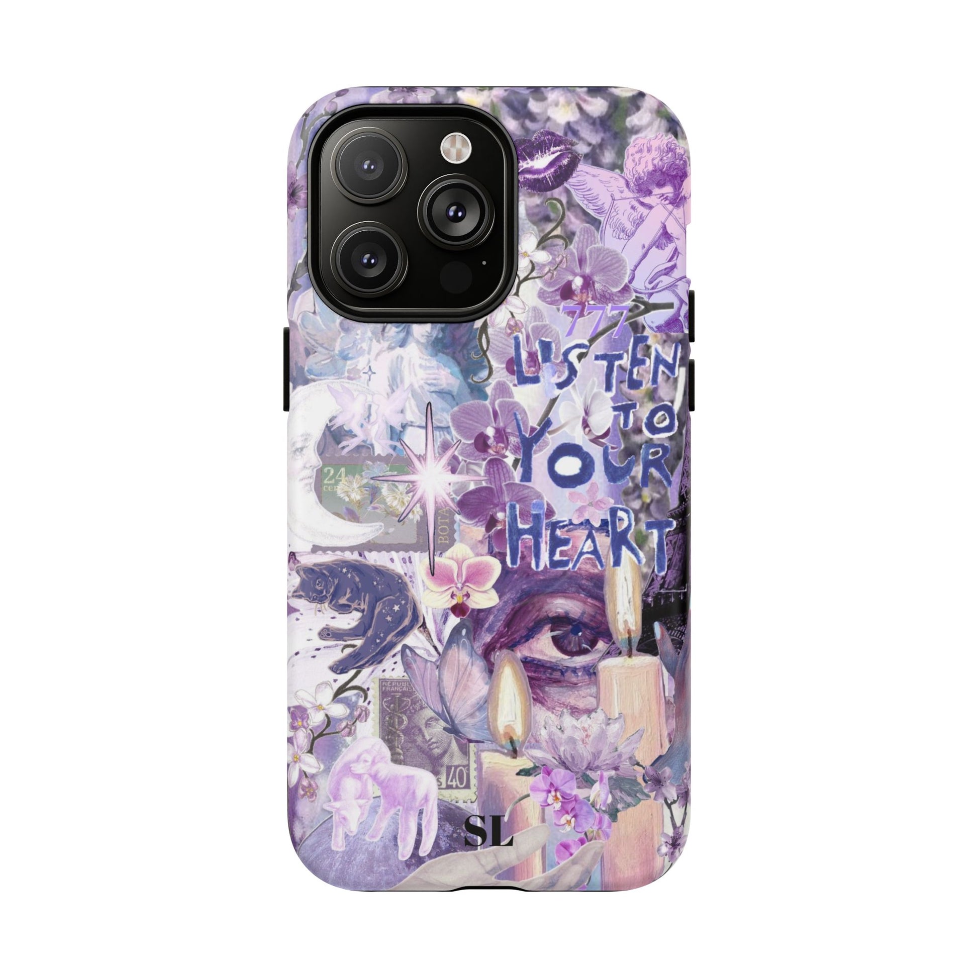Dive into a mystical daydream with the "Reverie Purple" phone case. Ethereal purple orchids, celestial icons and the soulful "Listen to Your Heart" mantra create a visual rhythm that mirrors your favorite deep-cut tracks, the perfect backdrop for a life lived in tune.