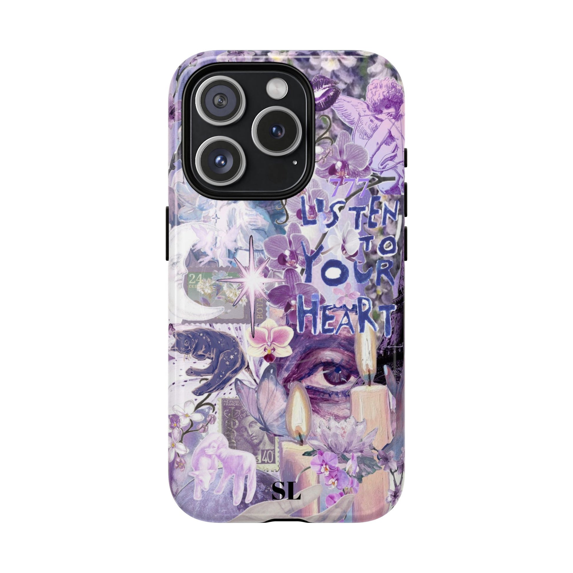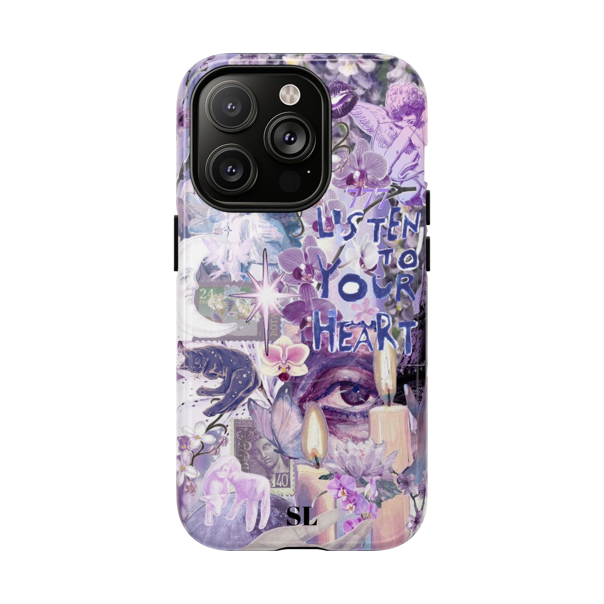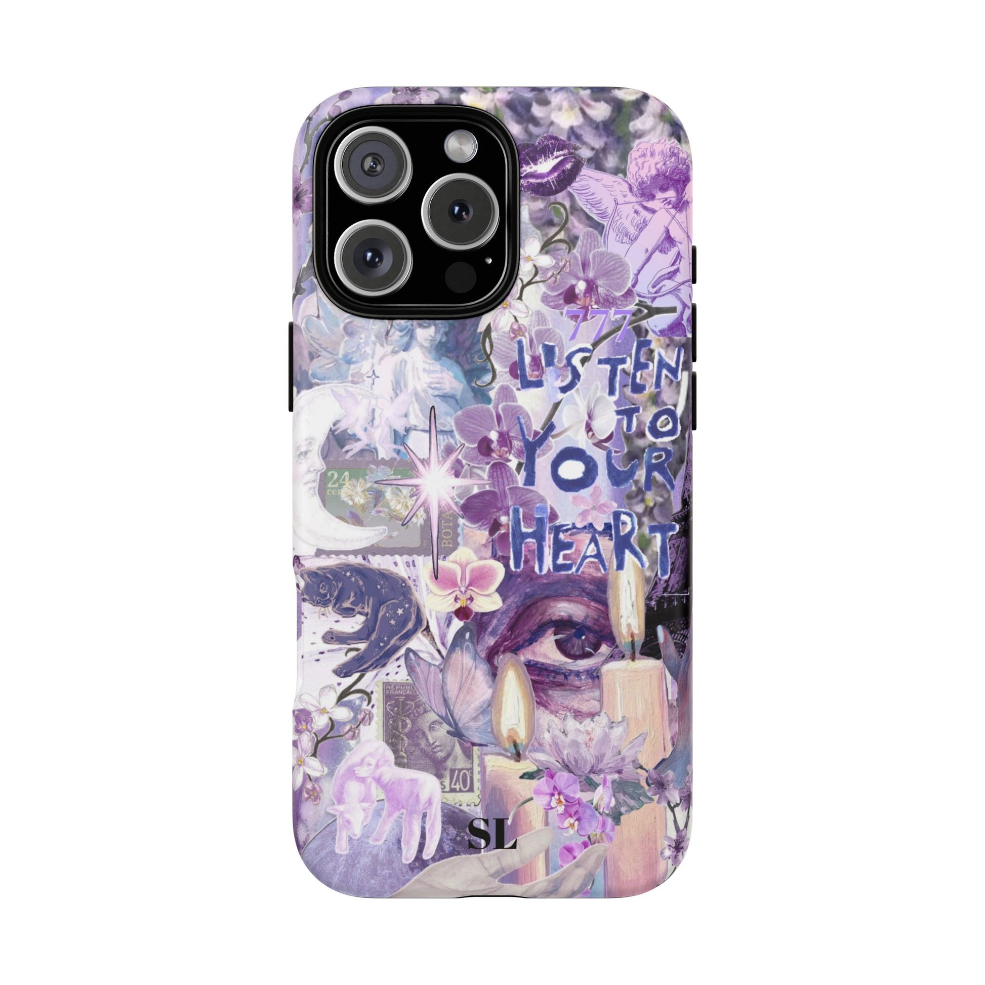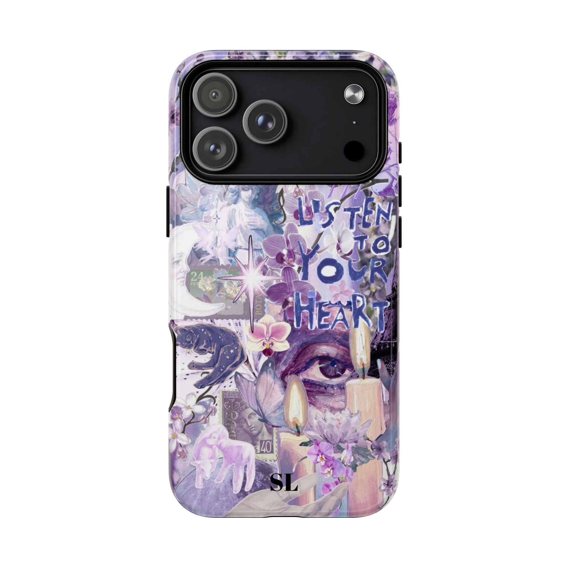 Dive into a mystical daydream with the "Reverie Purple" phone case. Ethereal purple orchids, celestial icons and the soulful "Listen to Your Heart" mantra create a visual rhythm that mirrors your favorite deep-cut tracks, the perfect backdrop for a life lived in tune.