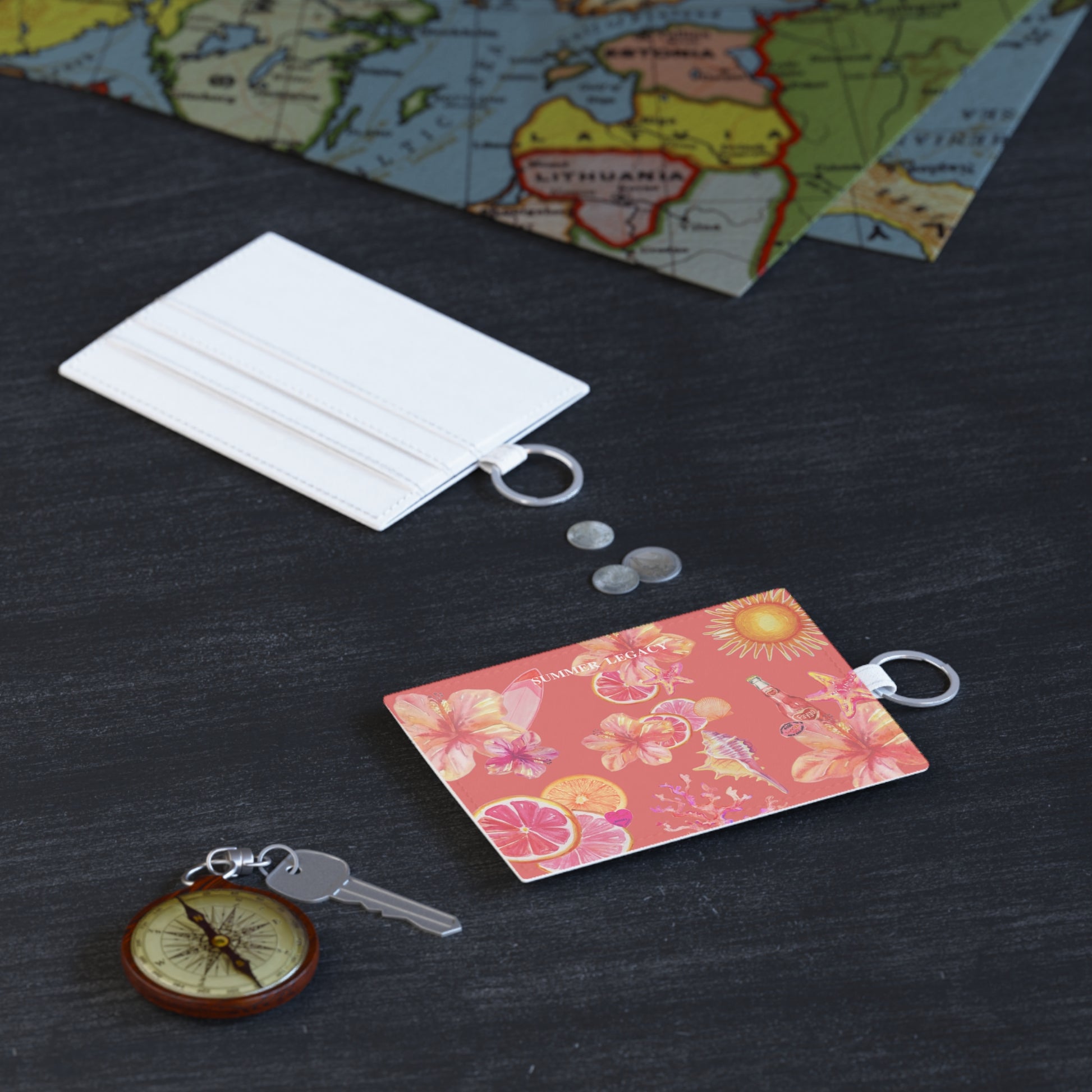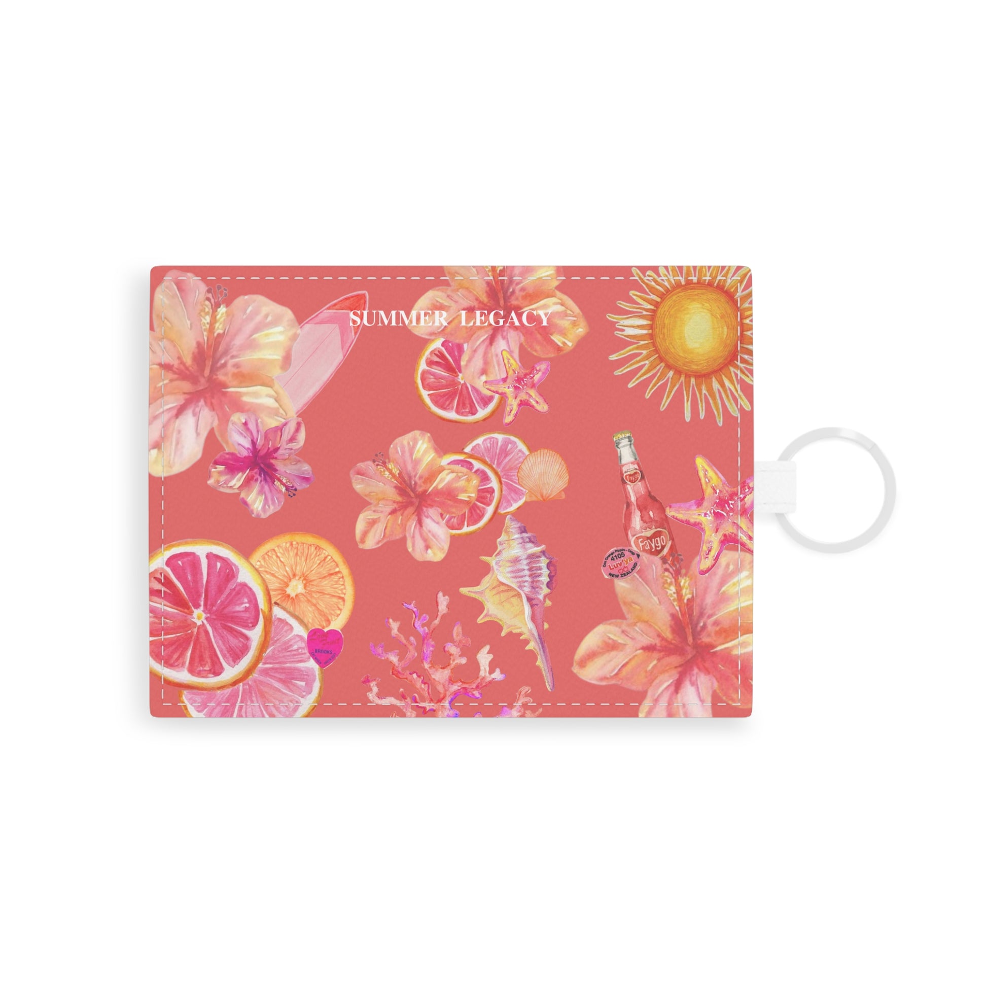 Inspired by golden hour glow, the Sunset Aura card holder blends ocean treasures and dreamy hibiscus blooms on a warm coral backdrop. It's the perfect pocket-sized accessory to carry a little slice of summer wherever you go—sunshine, sparkle, and all.
